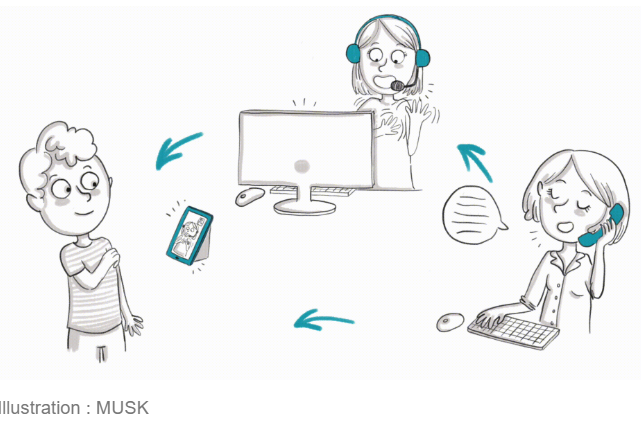 Vos bénéficiaires sourds peuvent avoir accès directement à votre plateforme téléphonique depuis votre site internet via un interprète à distance. La personne sourde, entendante et l’interprète ne sont pas au même endroit, comme vous l’explique le schéma suivant :