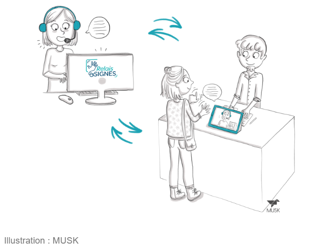 Pour l'accueil de vos bénéficiaires sourds au guichet. Depuis une tablette/un ordinateur, vous téléchargez notre système et pouvez ainsi appeler un interprète qui traduit la communication à distance.